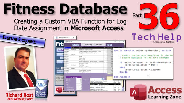| 2025-09-16 | | Fitness 36 | Microsoft Access Fitness Database Part 36: Creating a Custom VBA Function ... |