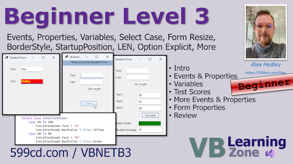 | 2023-10-07 | | VB.NET Beginner 3 | Events, Properties, Variables, Select Case, Form Resize, BorderStyle, Start... |