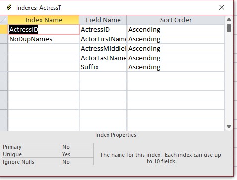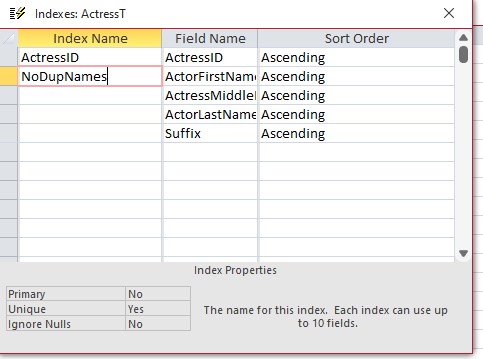 I am having a problem with my composite keys. I have a table that I don't want duplicate name in. I have setup the indexing as shown in the screenshot. But I am still allowed to put duplicate names in. What am I missing? I think that this worked at one time but now it isn't. I have watched the lesson about Composite keys (Expert 23 3) and I can't figure this out.