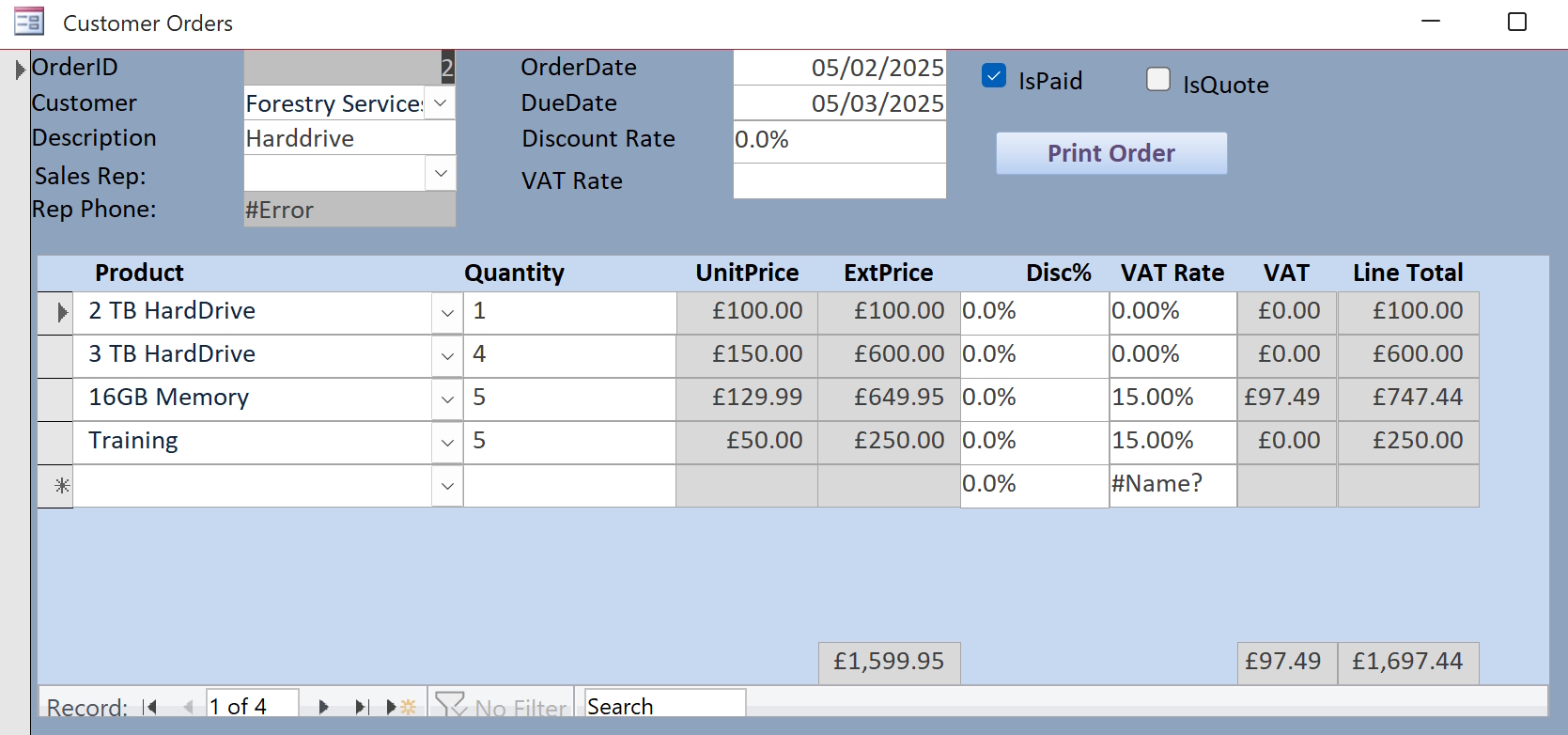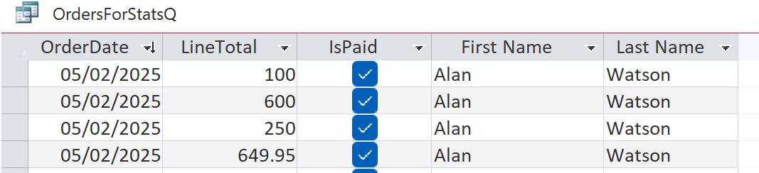 I have updated an order for a customer for the 5th February 2025 (which is a date in the last 30 days) and so should be displayed on the MainMenuF using the property  =DSum("LineTotal","OrdersForStatsQ","OrderDate>= #" & Date()-30 & "#"). Only it doesn't!.