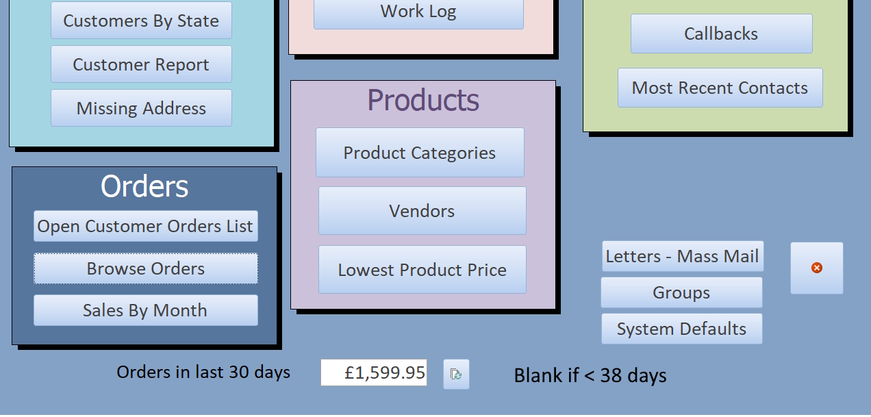 However, if I change the property to =DSum("LineTotal","OrdersForStatsQ","OrderDate>= #" & Date()-38 & "#") it does display the total value of the orders in the last 30 days. ie £1559.95. Any less than 38 results in a blank box.