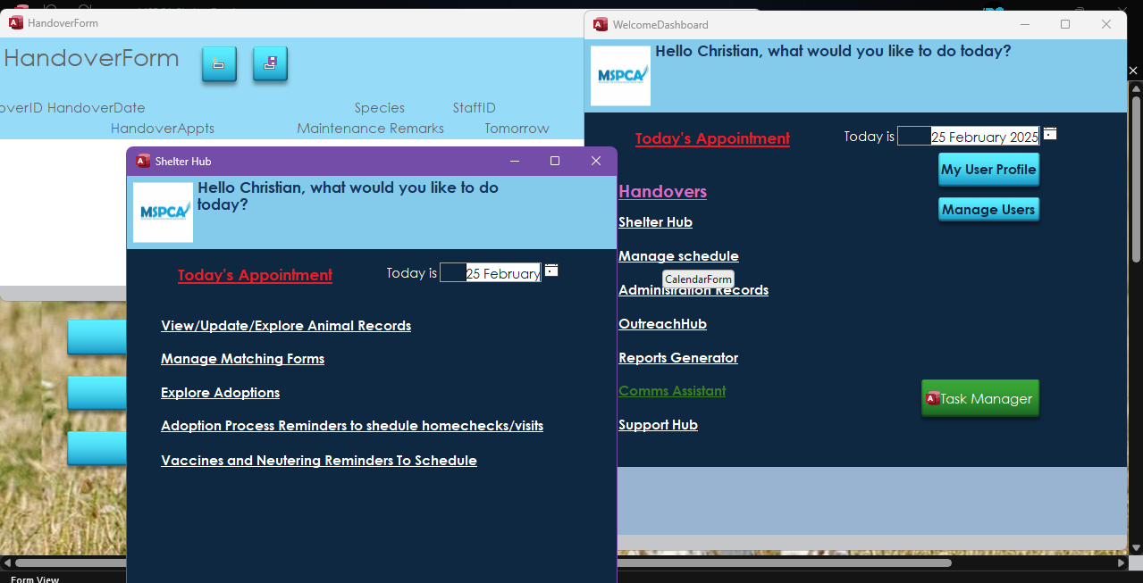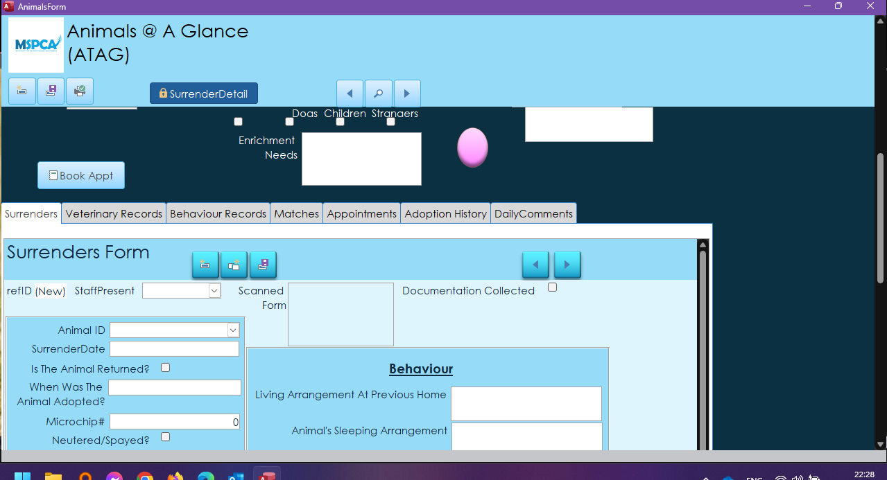 Surrenders chech through anial records and adoptions to idetify returns automatically and update required fields as needed. Ive added some titbits for our outreach team to record our Foodbank ration client quota and comms to generate AI assisted letters and query GDPR compliant contact lists.