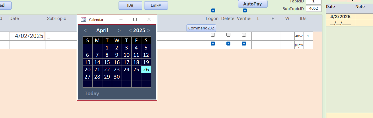 If I click on the EvenDate on the left, I would love if the calendar would open on at the point where I clicked, so if it is a cont. form it would still open at the point I clicked, even if it was at the bottom. Also, the NoteDate at the right (yellow), if I click there, it would be great if the calendar would open there instead of the other side of the screen. I use this on multiple forms, and I tried getting the x,y coordinates and moving or opening the form at those coordinates, but nothing works.