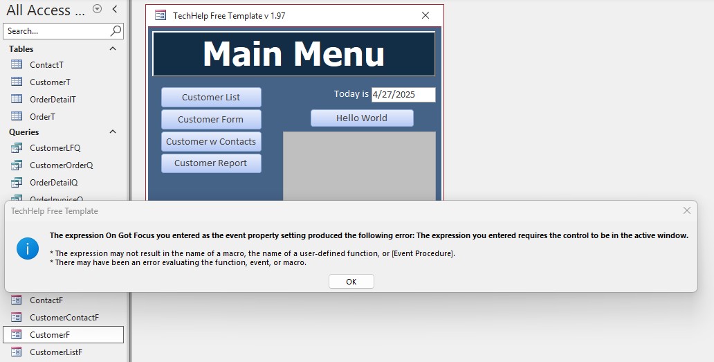 Is anyone having this issue besides me?  If I open the Customer Form from the Main Menu, it opens fine. But, if I open it from the Navigation Pane I get the following error every time.