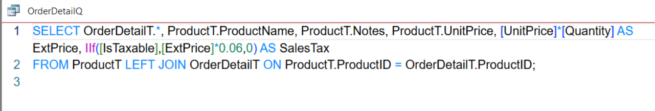 SELECT OrderDetailT.*, ProductT.ProductName, ProductT.Notes, ProductT.UnitPrice, [UnitPrice]*[Quantity] AS ExtPrice, IIf([IsTaxable],[ExtPrice]*0.06,0) AS SalesTax