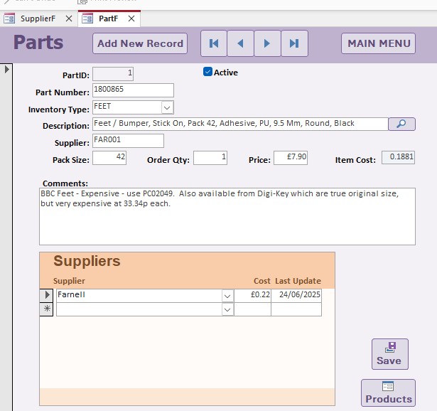 When I get updated prices from a supplier, I update the current costs as Richard suggested on the Supplier subform, but because this only updates the field in the junction table, the Item Cost field in the Parts Table isn't updated. I have to do everything twice, which can be very time consumming.