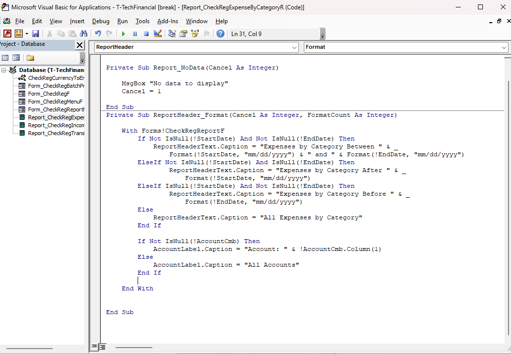 Field names do match. Form and report names have not changed. I checked Trust Center and it is a trusted location. The event is not in the On Format property. I'll fix that. Thank you.