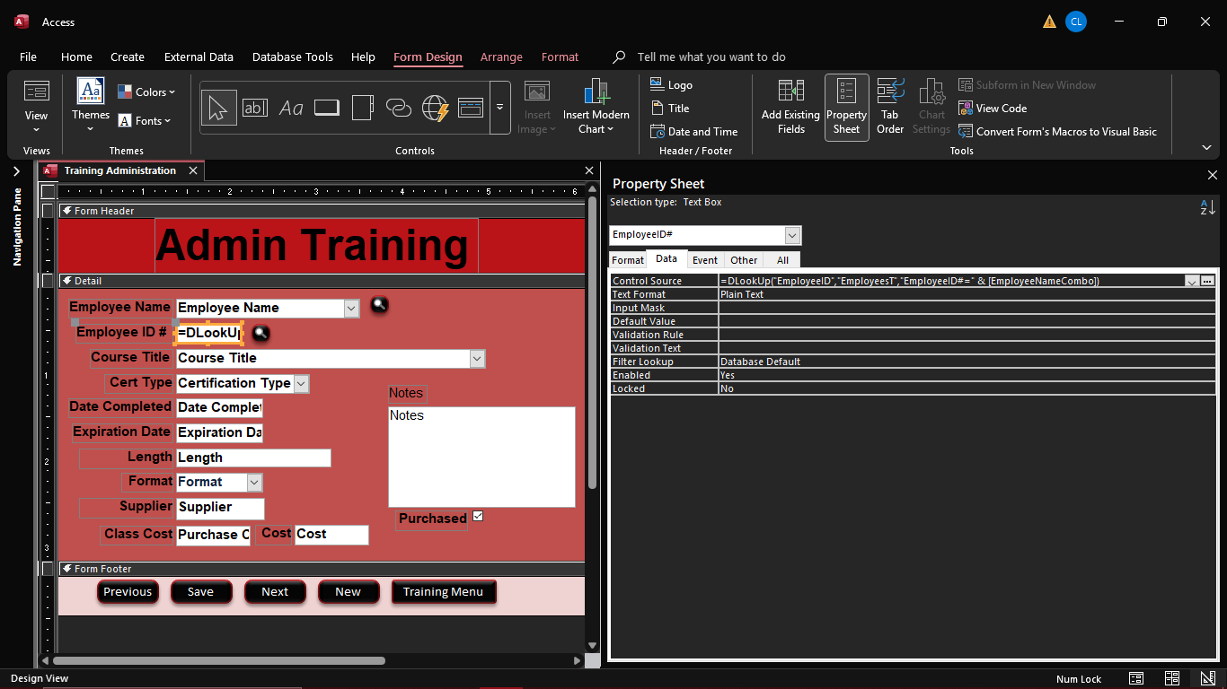 That being said, if your combobox is set up with the EmployeeID hidden in the first column as shown in Richard's videos, then you don't need the DLookup at all. Just set the control source of the EmployeeID textbox to =EmployeeNameCombo and it will automatically update when a new employee name is selected.