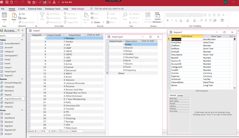 Now I am trying to incorporate the check register information into the Association Database. I included the bank information, fund types, etc. into the helper table. I made a separate table combination for the tax accounting information because I need to create cascading combo boxes for account/category information.