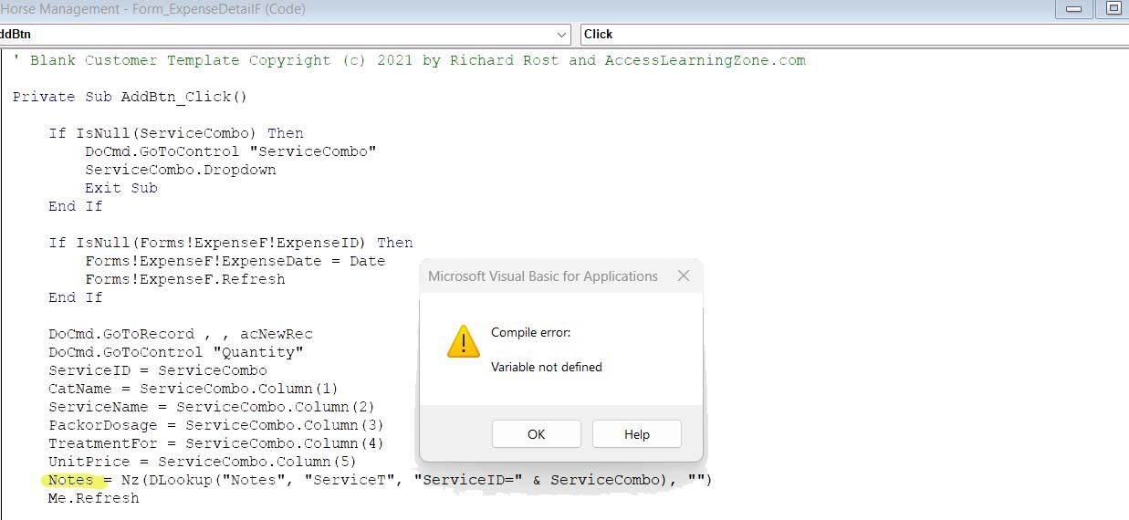 Now that you've taken InjuryID off, it's getting further down your code before running into an error. It's basically saying that it can't find a control on the ExpenseDetailF named "Notes" and/or it can't find a field in the table named "Notes"