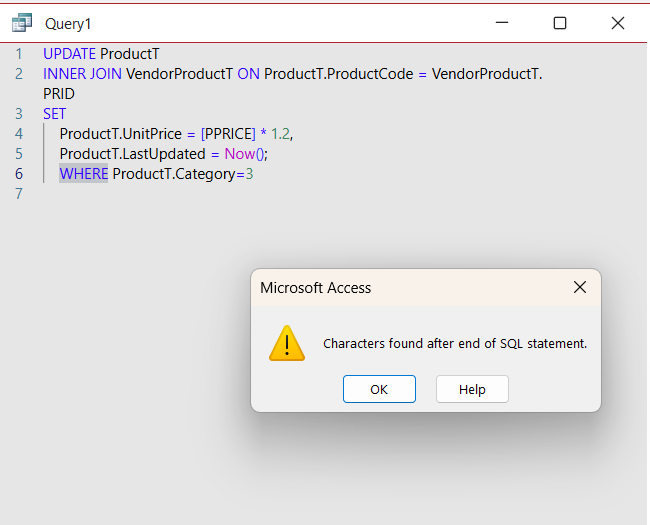 I am trying to close and save this query to move on to the next lesson, but I am getting an error message. Apparently, I'm missing a step. I rewatched the video a few times, and it looks the same, but I get that message. Thanks Ken
