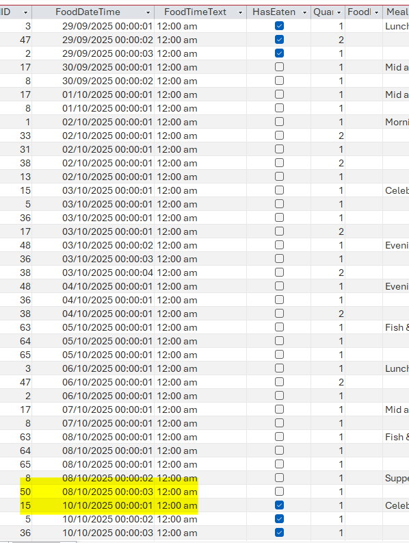 My thanks again. I did the alteration as per your first post, but it made no difference. In the FoodLogF code my Order By was already FoodDateTime DESC.