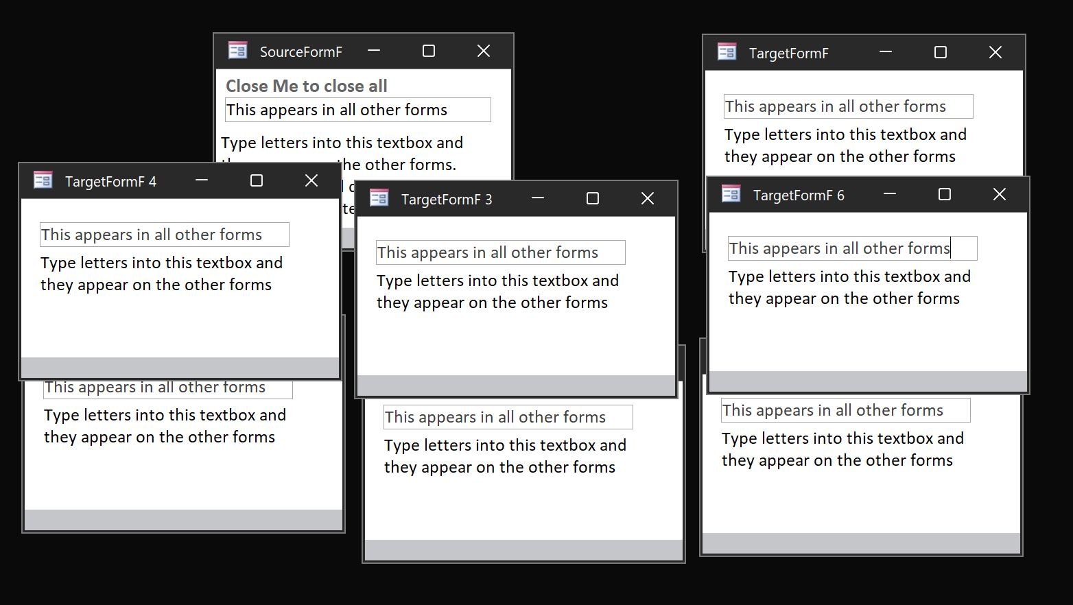 Once multiple forms are displayed, typing into the textbox of any form immediately updates the textbox content in all other forms. This confirms that all forms are both sending and receiving events.