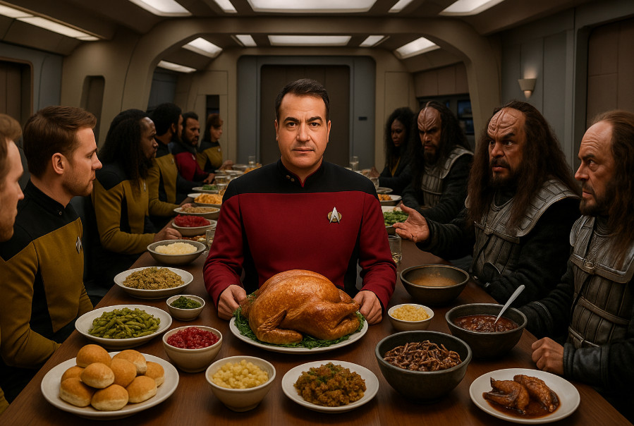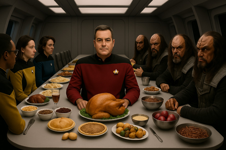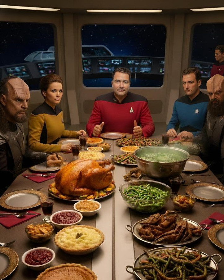 I am now fortifying both my mind and my warp core for tomorrow's incoming barrage of calories, carbohydrates, and whatever the Klingons classify as food. Tactical predicts heavy gravy fire, possible pie shrapnel, and at least one bowl of live gagh posing as a light appetizer. Shields will be set to maximum, though I doubt they will hold once the stuffing hits the table.