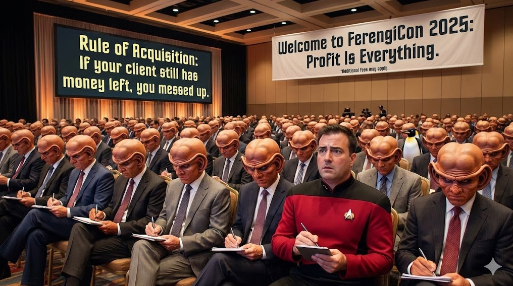 Captain's Log: I'm out of the office for the rest of the weekend attending a Ferengi conference on e-commerce. Their keynote motto is, "If your client still has money left, then you're not doing your job." I'll be back on Monday. If it's truly urgent, please contact me via subspace. I'll get to it as soon as I'm done brushing up on my Rules of Acquisition.