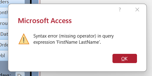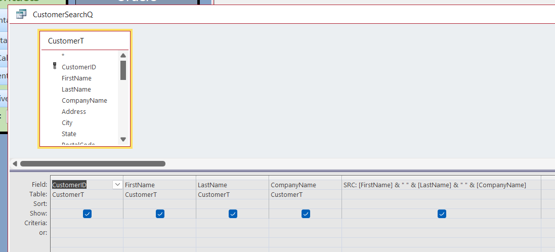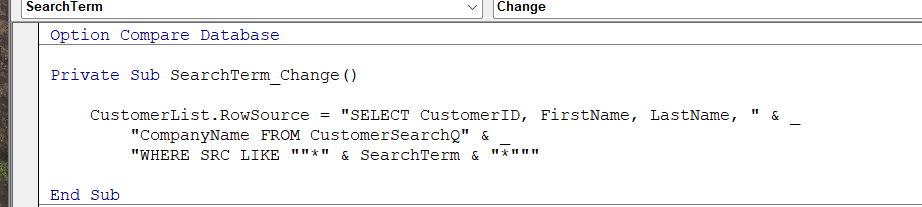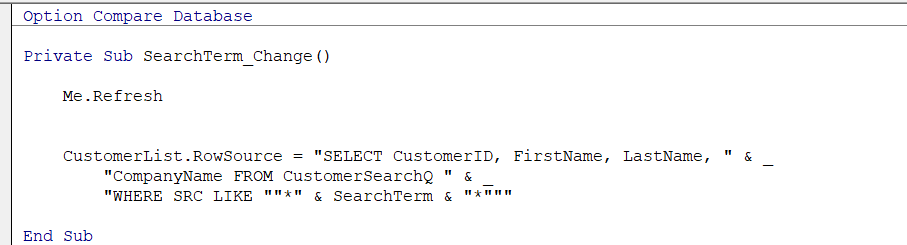 Hi Ken, based on your last image of VBA, there should be a space AFTER CustomerSearchQ before the quotation marks. With the line continuation, Access will read it as "FROM CustomerSearchQWHERE SRC LIKE"...