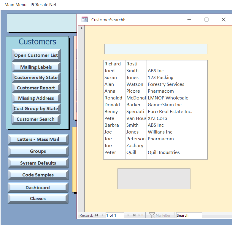 In actuality, it's: Make a query and add a calculated field to concatenate searchable text; Make a form, add a listbox, set the rowsource to the CustomerT and give it a name, add a textbox and give it a name, learn about Ascii, learn about the On Change event.... and so on.