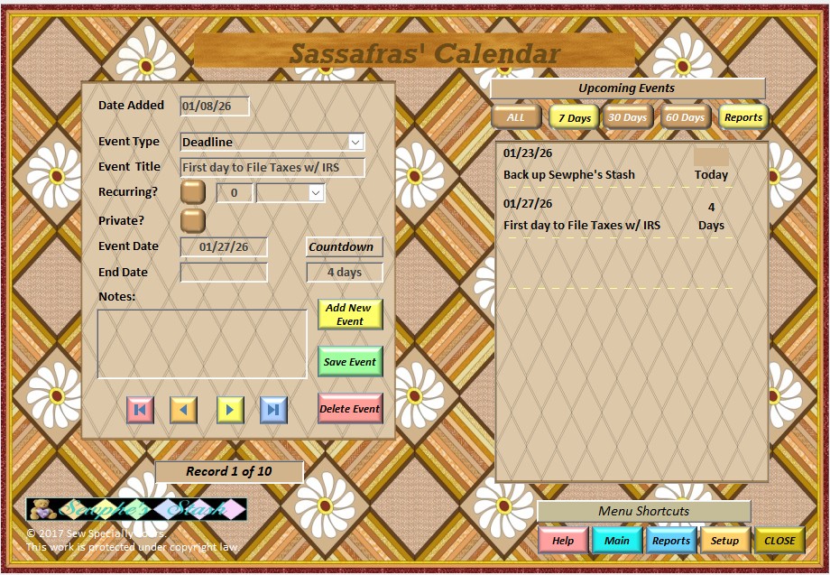 Thanks Richard!  Designing the backgrounds in EQ8 allows me to kill two birds with one stone: designing a quilt pulling from the fabrics in my stash, and using those designs to make the database uniquely my own.
