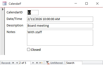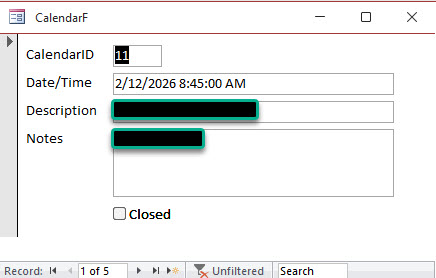 SELECT CalendarID, ApptTime, Description FROM CalendarQ WHERE Forms!DatePickerF!StartDate>=CalendarDateTime AND Forms!DatePickerF!StartDate<CalendarDateTime + 1 ORDER BY ApptTime;
