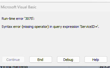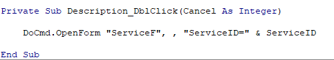 DoCmd.OpenForm "ServiceF",,,"ServiceID=" & ServiceID