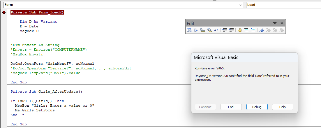 then I removed it from the form and change its name at the table level to MyDate, and got the same error message 2465?