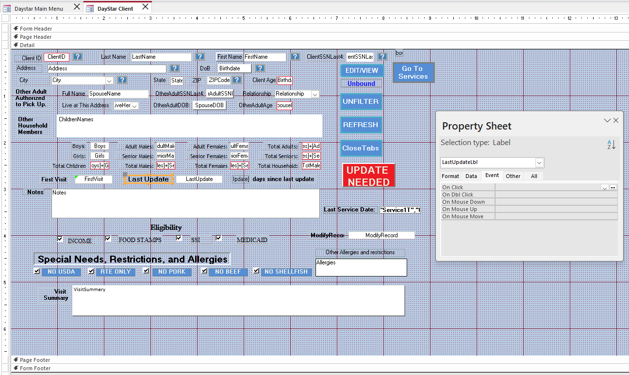 Stephen as a side note, in the design view of your "DayStar Client" form, I notice that there is a little "flag" on the "FirstVisit" control. You might want to check that out and see if it's the control name or the control source throwing the warning