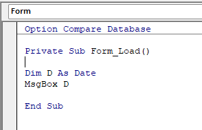 I recreated your code exactly as posted and it runs fine here. Using a Variant works, although technically you'd want D declared as a Date. Either way, that assignment is valid. My guess is you've got something on the form named Date and it's creating a naming conflict.