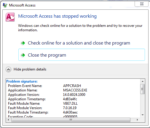 That kind of APPCRASH in VBE7.DLL is usually something environmental, not specific to your database, especially since you're seeing it across multiple files. I'd recommend running through my standard Access Troubleshooter first since it walks through the most common causes step by step like Office repairs, add-ins, references, and system issues. Given that you're on Access 2010 and Windows 7, you're also dealing with some pretty old components, so instability like this can pop up. Start with the troubleshooter and if it's still happening after that, post back and we can dig deeper.