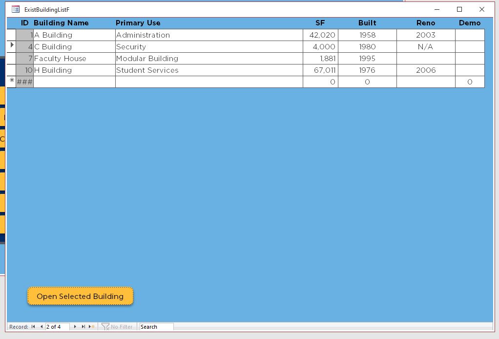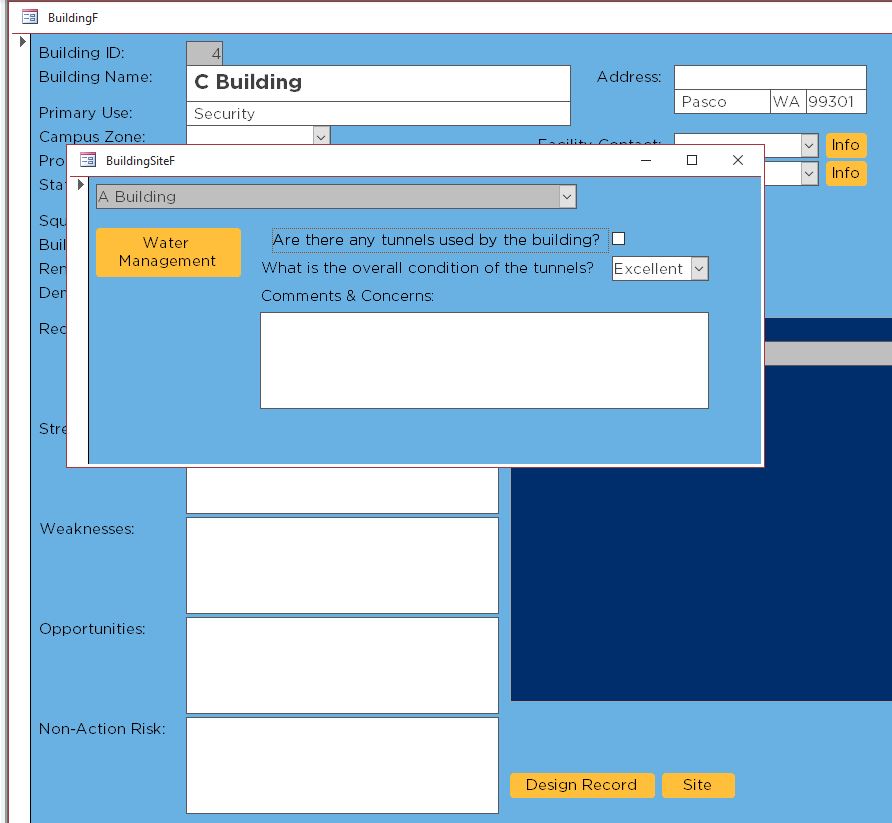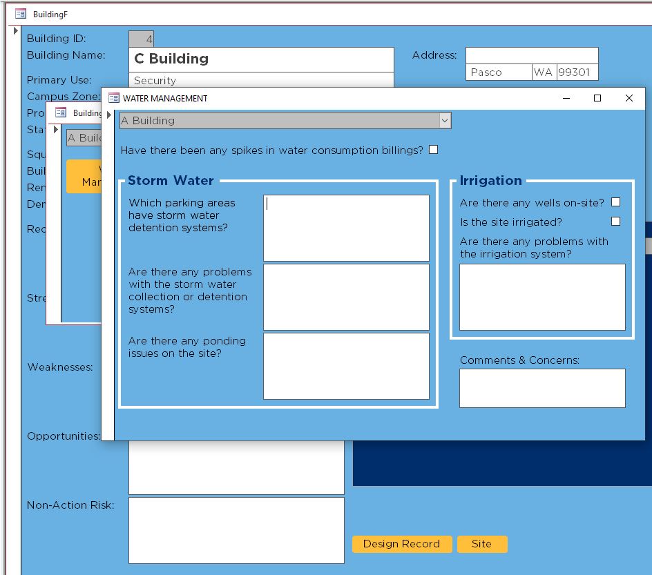 From the Main Menu, I click on "Existing Buildings"; no problems.  From the Existing Building Form, I click on "Open Selected Building"; no problems.  From the Building Form (which is where the end users will be doing 85% of the work), I click on "Design Record"; no problem.  However, when I click on "Site", it brings up the Building Site Form for "A Building"; when I click on "Water Management", it brings up that form for "A Building" as well.