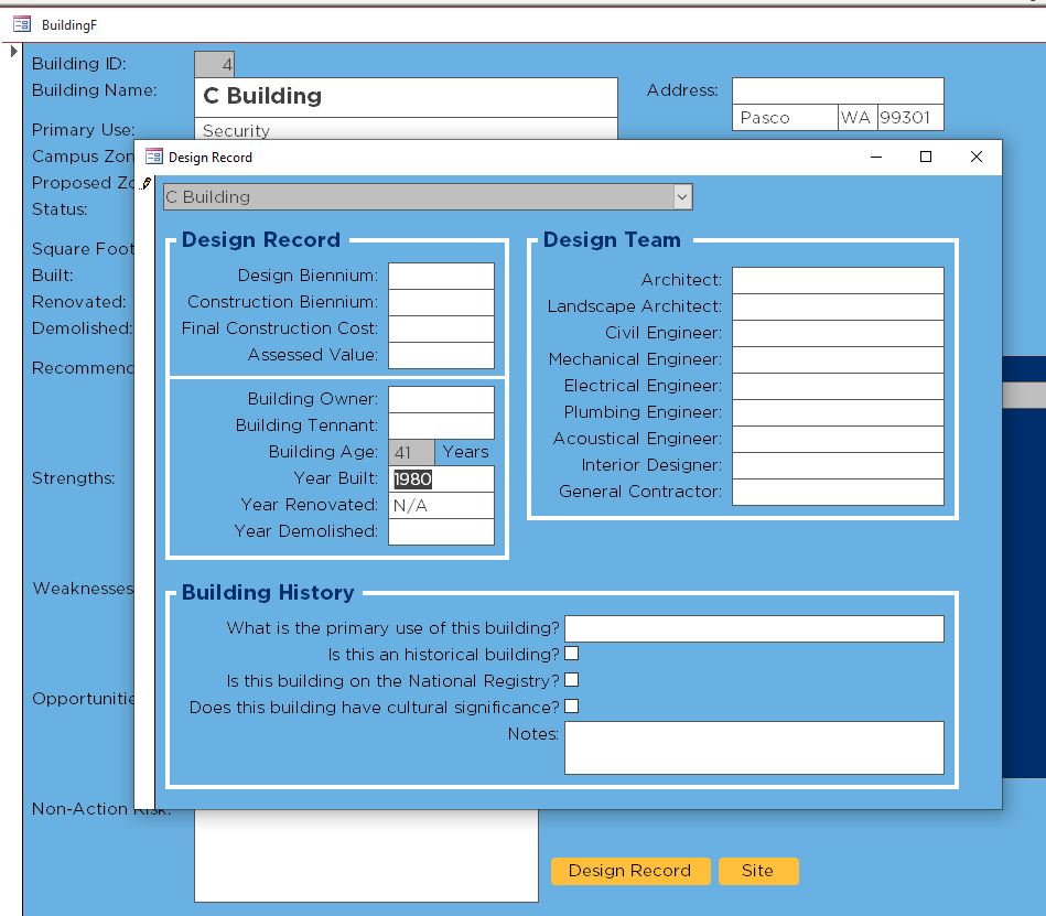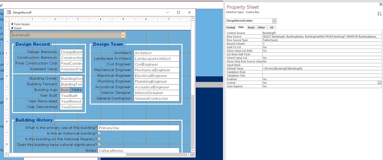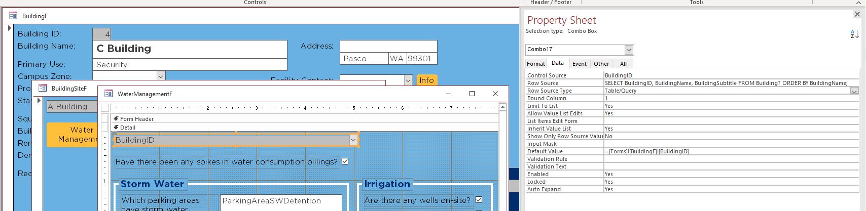 NOTE: the information for "DesignRecordF" comes from "BuildingT" which is my primary table.  "BuildingSiteF" and "WaterManagementF" come from "BuildingSiteT" which is a table that relates back to "BuildlingT" via the "BuildingID".  Because of the scope of the work, I will eventually have 7 more tables that relate back to "BuildingT" -- there are just so many questions/issues involved in the condition assessment of building facilities.