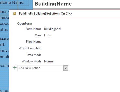 @Adam: on the BuildingF, I followed your instructions and it worked; I did, however, change the command to open "BuildingSiteF" which is what I want to open from the building form.  When I changed buildings, it still worked: it opened the correct building site form as it relates to the building form.