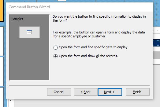 When using the Command Button Wizard, when prompted to "...find specific infomation to display...", I kept choosing "...show all the records..." instead of "...find specific data..." so my forms were not linking the BuildingIDs.