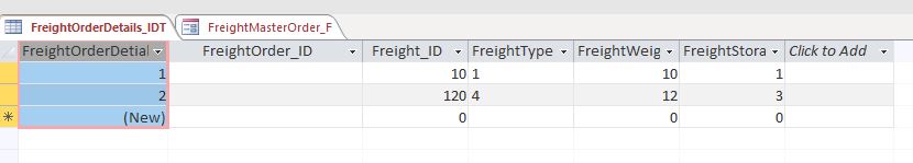 1: I have a single form with two subforms linked to the freightorder_idt and the freightorderdetails_idt  The problem I am having is, everything seems to be working properly.  I can add records and save them however the freightorder_id is not being populated into that field in the freightorderdetails_idt.  I think that is a fundamental relational issue, or perhaps the way I have built the form but ideally: