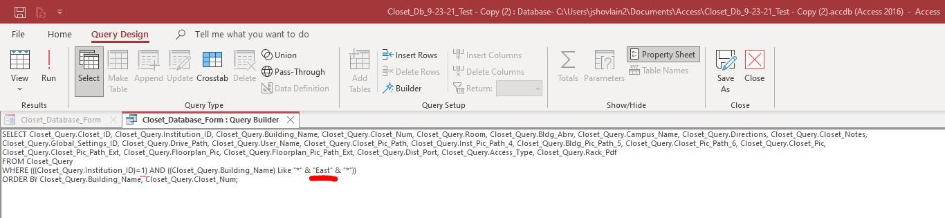 Using the principles described in the video you suggested, i have entered the wild card criteria in the building name column and from the sql view i have manipulated the code (by replacing the controls with the text  "1" and "East", underlined in red) from there i can get the data sheet to display what is needed. I just don't understand how to get the drop down list to filter accordingly.