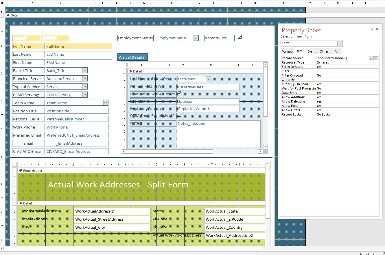 You can see from the files I just uploaded, I'm trying to create a Data Entry form with two subforms in it.  I'm interested in your ideas.  The form is based on a query with outer joins.  I can start to create a new file, but then it gives me the error "You cannot add or change a record because a related record is required in WorkActualAddressT."