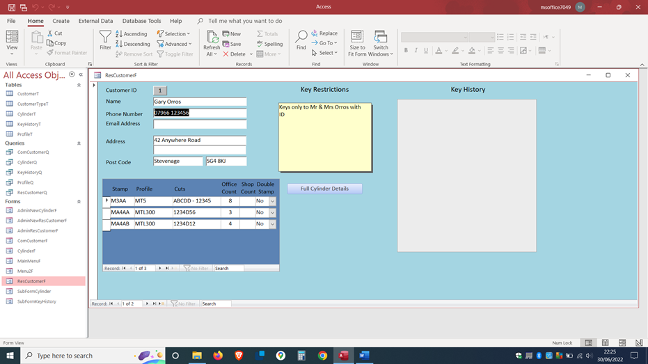 I'm a locksmith and trying to hold customers and lock details in a database. I have a main form based on the customer with a cylinder subform which holds the locks they own. This is a continuous form and works fine but the bit I can't get to work the way I need is the 2nd subform, which is the key history. This is stored in a separate table and linked to the locks via an ID number (CylinderID).