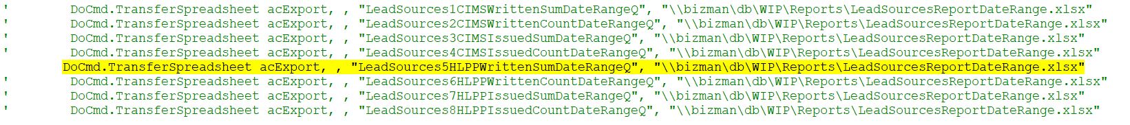 I've created 8 Crosstab Queries (Pic 1) which are exported into an excel spreadsheet using a button (Code on button in Pic 2). The big man has now asked that he wants the option to specify a date range which I have successfully done thanks to Ricks teachings (Including declaring the parameters - Pic3)