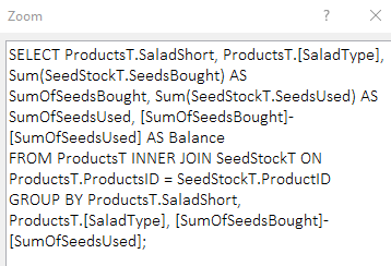 But in the SQL there is the aliases SumOfSeedsBought and SumofSeedsUsed.  When I click ok through the asked parameters the query is working fine so it is recognizing the fields.