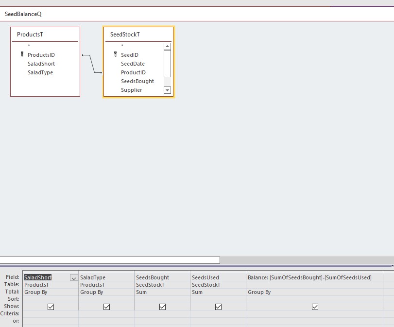 You don't have the fields SumOfSeedsBought or SumOfSeedsUsed in the query. You can tell it's looking for a field name by the brackets [FieldName]. I'm guessing that field isn't working properly either. You need to alias your two sum fields or use two queries. SumOfSeedsBought: SeedsBought with the sum total and same for used