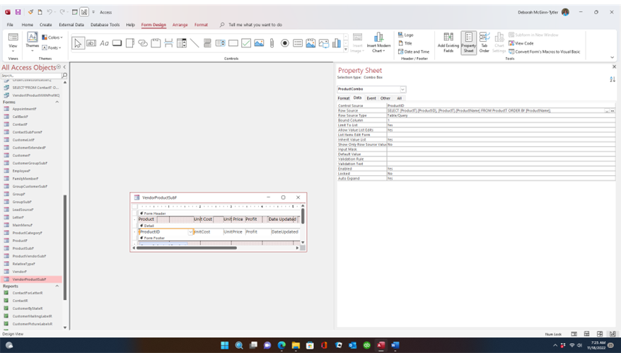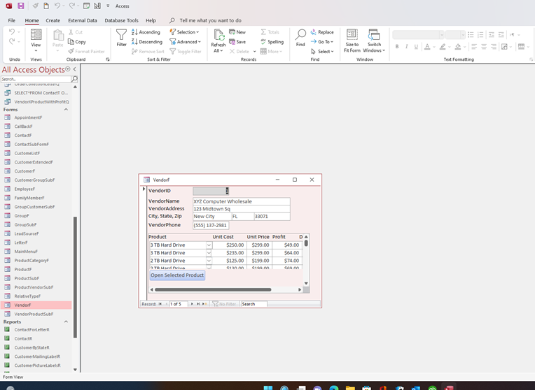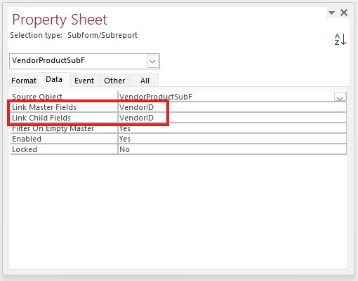 Before changing my record source from ProductT to VendorXProductWithProfitQ, My vendor form properly displayed the products associated with the specific Vendor displayed on the Vendor Form.  After following the lesson instructions to add the profit and unit price to the subform, my Vendor form now displays Products from every vendor on all the vendor pages.  What am I doing wrong?  I am using Access 365.
