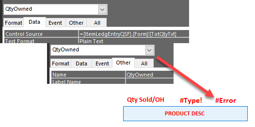 main form text box/control source =Nz([ItemLedgEntryQSF].[Form]![TotQtyTxt],0)