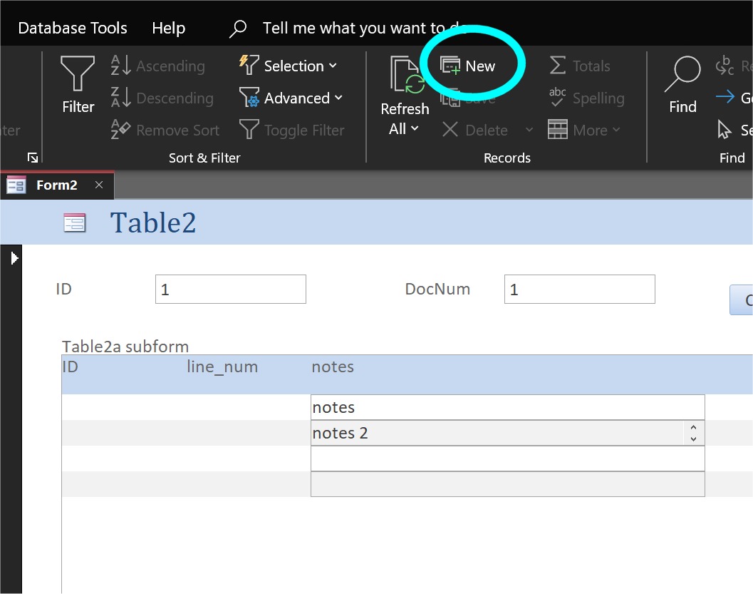 Parent form "frmMenu_Main" has a subform control "MainSub1".  The form loaded to this control (SourceObject) depends on a menu and in this case it is loading "frmAssociation_List", which is a continuous form based on "tblAssociation".  Once frmAssociation_List is loaded, it has a list of company names and the company primary key (long integer) hidden.  The first record in the Association table is called "<Add New>" and is always first on frmAssociation_List due to On Load sort order.  Clicking on the Add New record in the list triggers an event housed in that form's builder...