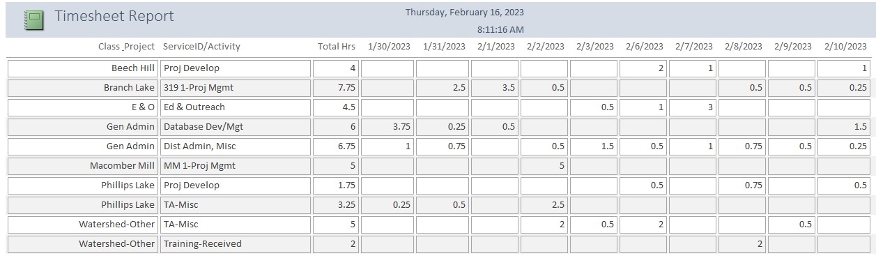 Trying to force Access to create a report similar to an Excel spreadsht currently used (image attached). The closest I have come is using a crosstab query (image attached). The crosstab is based on a query that uses pay period end date as a parameter prompt. In the crosstab the parameter is defined. The crosstab query is used to create a report. When the report is opened it prompts the user 2x for the date. Once is ok, >1 is a nonstarter. Suggestions?