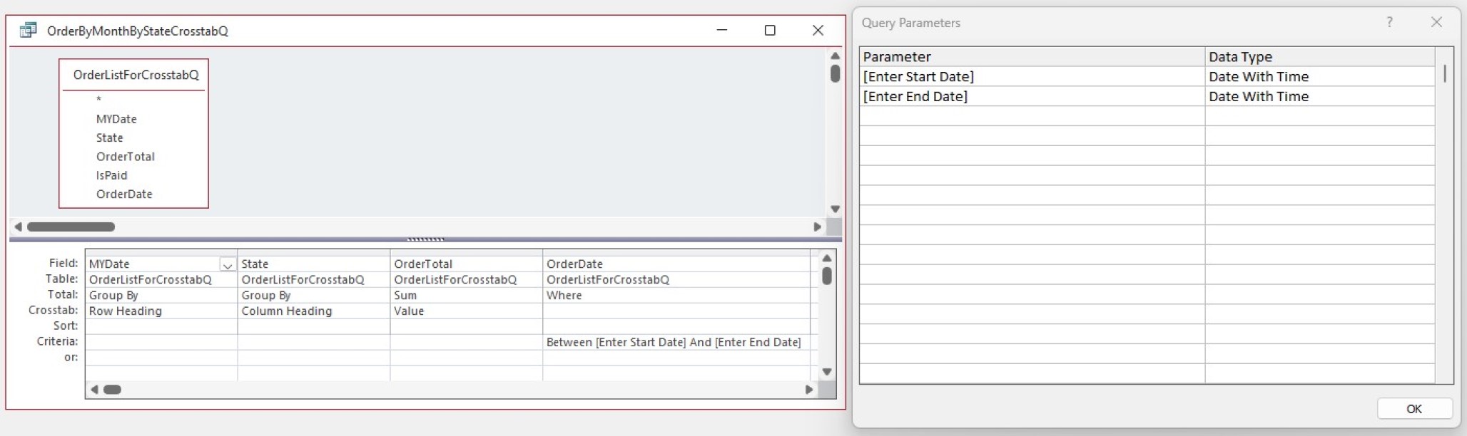 I'm trying to use a CrossTab Query to search Between Dates.  The CrossTab Query ask me twice every time for the "Start Date" and "End Date".  Like EXPERT-18-01 Lesson says, I put the Date Criteria in the (Helper) Query and "Start Date" and "End Date" in the (Helper) query's Parameter.  I also tried to declare (Start and End Date) in the Crosstab Parameter, but it didn't help.  Does anybody have any ideas?  Thank you in advance for your help.  Horace Conti