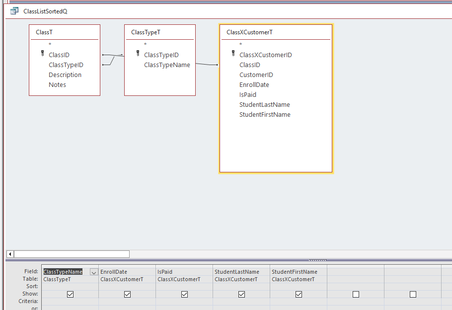 I would add the ClassID so you can open the Class Form from the Class List Form. I would also remove the Student information and take ClassXCustomerT out of the query other wise you will have each class repeating for each student that is in that class. The screenshot below shows a Class List Form similar to the Customer List.