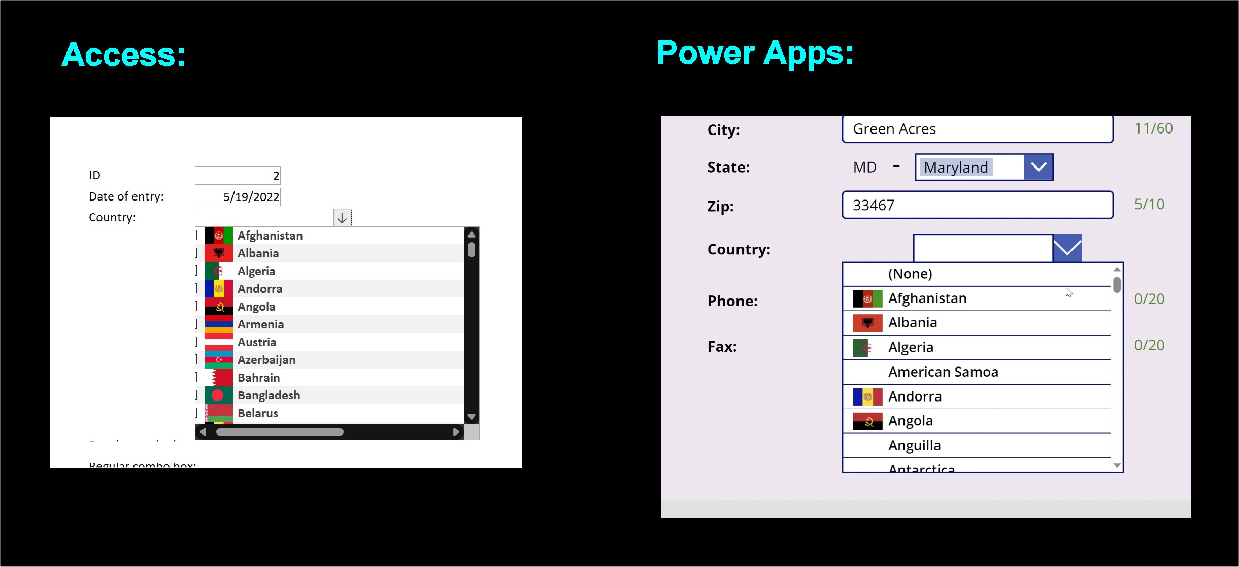 Basically, to create combo boxes with better formatting, you need to make fake combo boxes.  This is true in other programming environments as well.  I recently trialed Power Apps and it also requires fakery to create combo boxes with advanced formatting such as pictures (see pictures below).  Richard's recent videos on custom MsgBox also illustrates this fact: you often have to fake it to make it.  That's because no programming environment can do everything, and they always have some primitive features that clever developers have to work around.