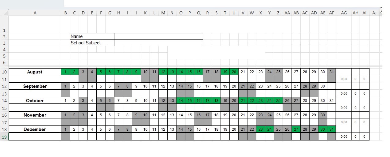 It is about lessons for students on the respective days of the year. If lessons have taken place, the duration is entered in hours (e.g. 1.5 for 1.5 hours), if the student has been absent with an excuse, there is an entry such as 'E' for 'excused absence', otherwise a 'U' for 'unexcused absence'.