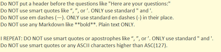 Thanks. I have it in the instructions for the bot to never use curly quotes, the smart quotes, only to use the regular flat ones. It always uses those curly ones no matter how many times I tell it, so I'll tell it again. Thanks for letting me know.
