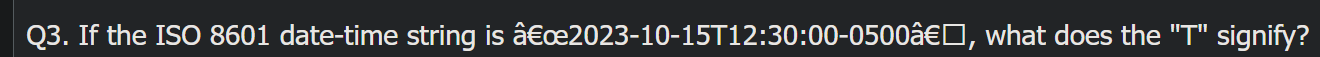 Q3. If the ISO 8601 date-time string is "2023-10-15T12:30:00-0500", what does the "T" signify?