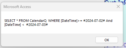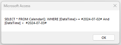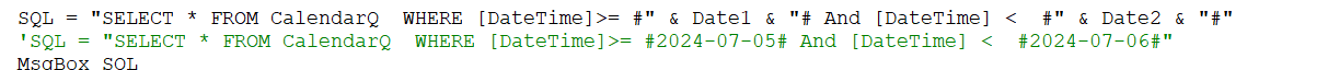 'SQL = "SELECT * FROM CalendarT_Temp  WHERE [DateTime]>= #2024-07-05# And [DateTime] <  #2024-07-06#"